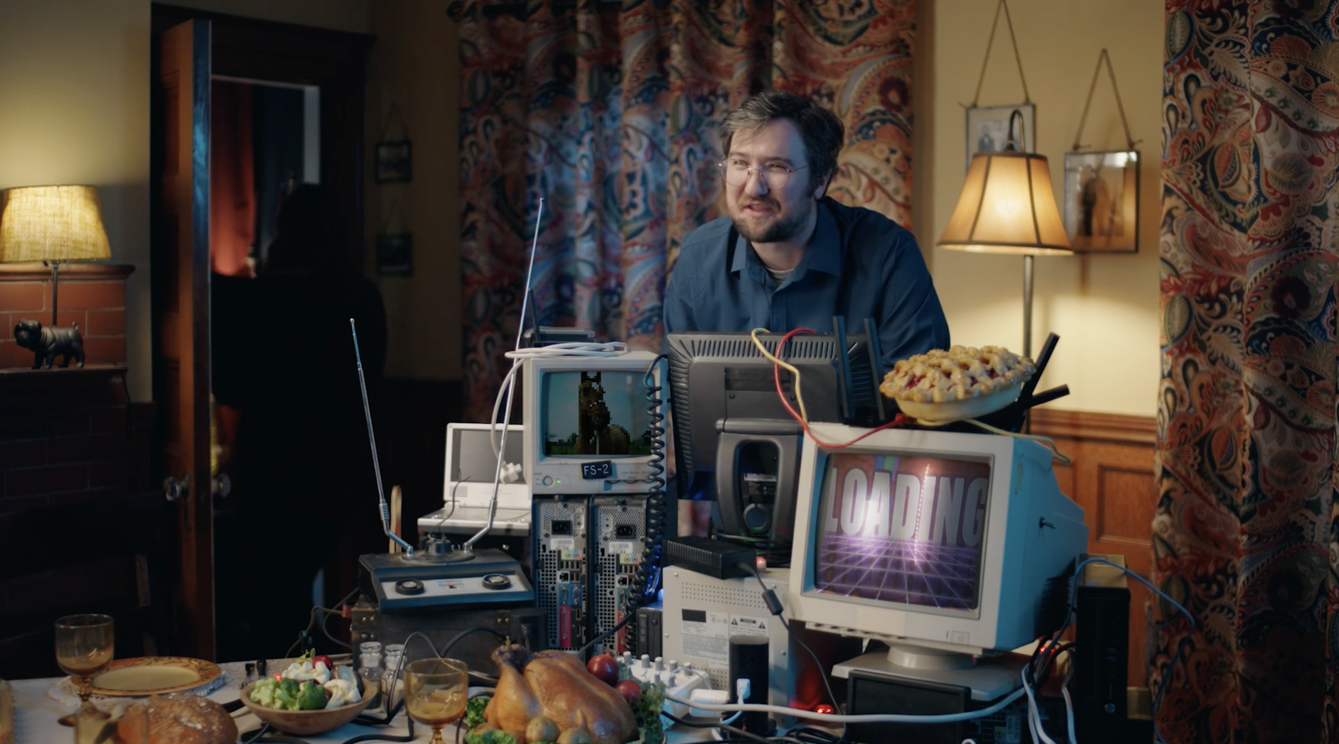 A man sits at a table covered with vintage computers, food, and drinks, with a pie on top of a monitor displaying the word "LOADING." Cozy room setting with patterned curtains.